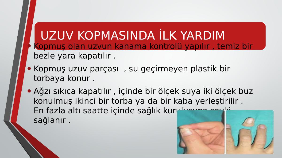 UZUV KOPMASINDA İLK YARDIM• Kopmuş olan uzvun kanama kontrolü yapılır , temiz bir bezle yara kapatılır .• Kopmuş uzuv parçası , su geçirmeyen plastik bir torbaya konur .• Ağzı sıkıca kapatılır , içinde bir ölçek suya iki ölçek buz konulmuş ikinci bir torba ya da bir kaba yerleştirilir . En fazla altı saatte içinde sağlık kuruluşuna sevki sağlanır .