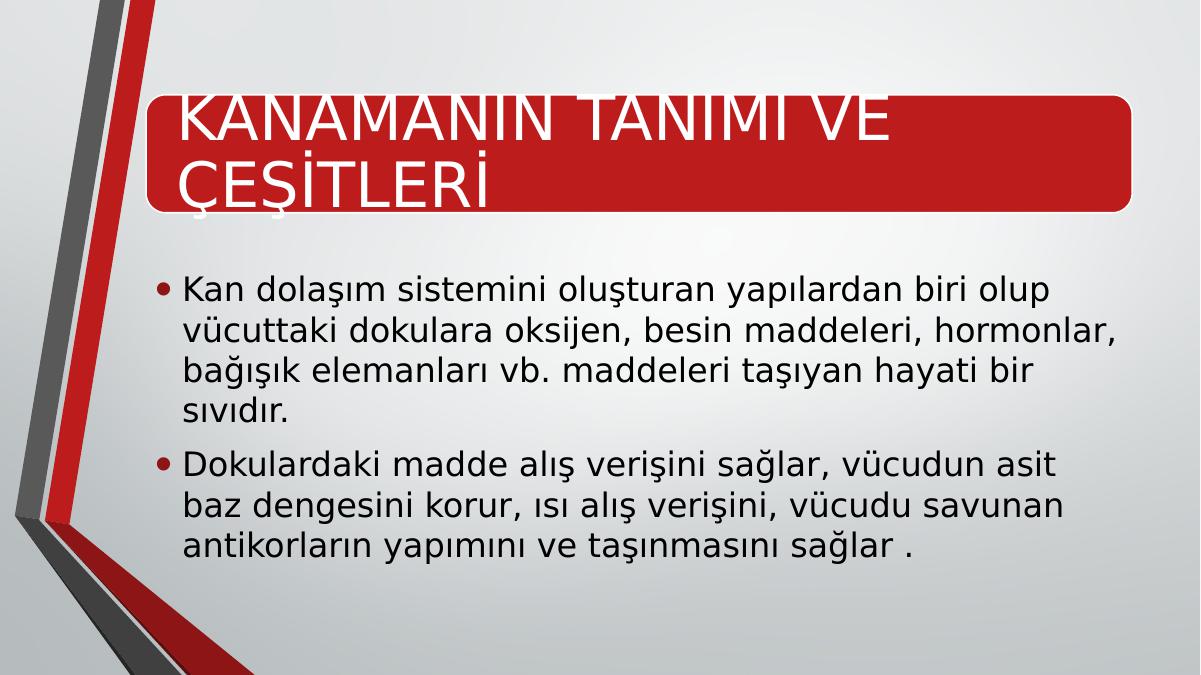KANAMANIN TANIMI VE ÇEŞİTLERİ• Kan dolaşım sistemini oluşturan yapılardan biri olup vücuttaki dokulara oksijen, besin maddeleri, hormonlar, bağışık elemanları vb. maddeleri taşıyan hayati bir sıvıdır.• Dokulardaki madde alış verişini sağlar, vücudun asit baz dengesini korur, ısı alış verişini, vücudu savunan antikorların yapımını ve taşınmasını sağlar .