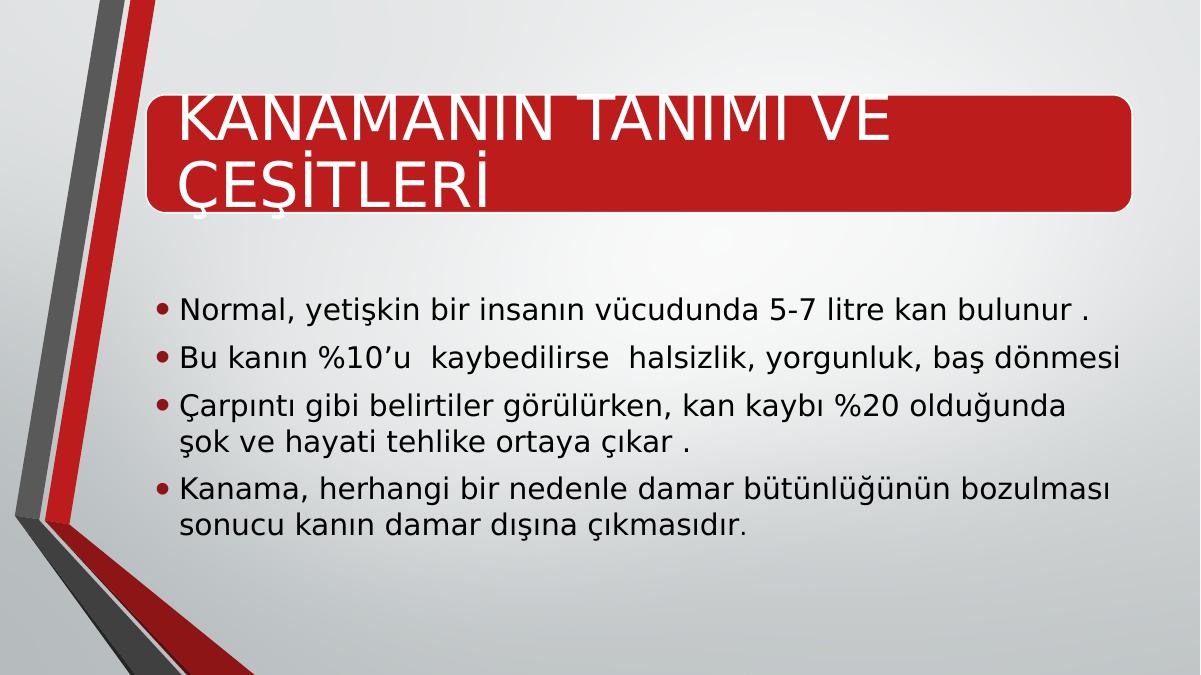 KANAMANIN TANIMI VE ÇEŞİTLERİ• Normal, yetişkin bir insanın vücudunda 5-7 litre kan bulunur .• Bu kanın %10’u kaybedilirse halsizlik, yorgunluk, baş dönmesi • Çarpıntı gibi belirtiler görülürken, kan kaybı %20 olduğunda şok ve hayati tehlike ortaya çıkar . • Kanama, herhangi bir nedenle damar bütünlüğünün bozulması sonucu kanın damar dışına çıkmasıdır.