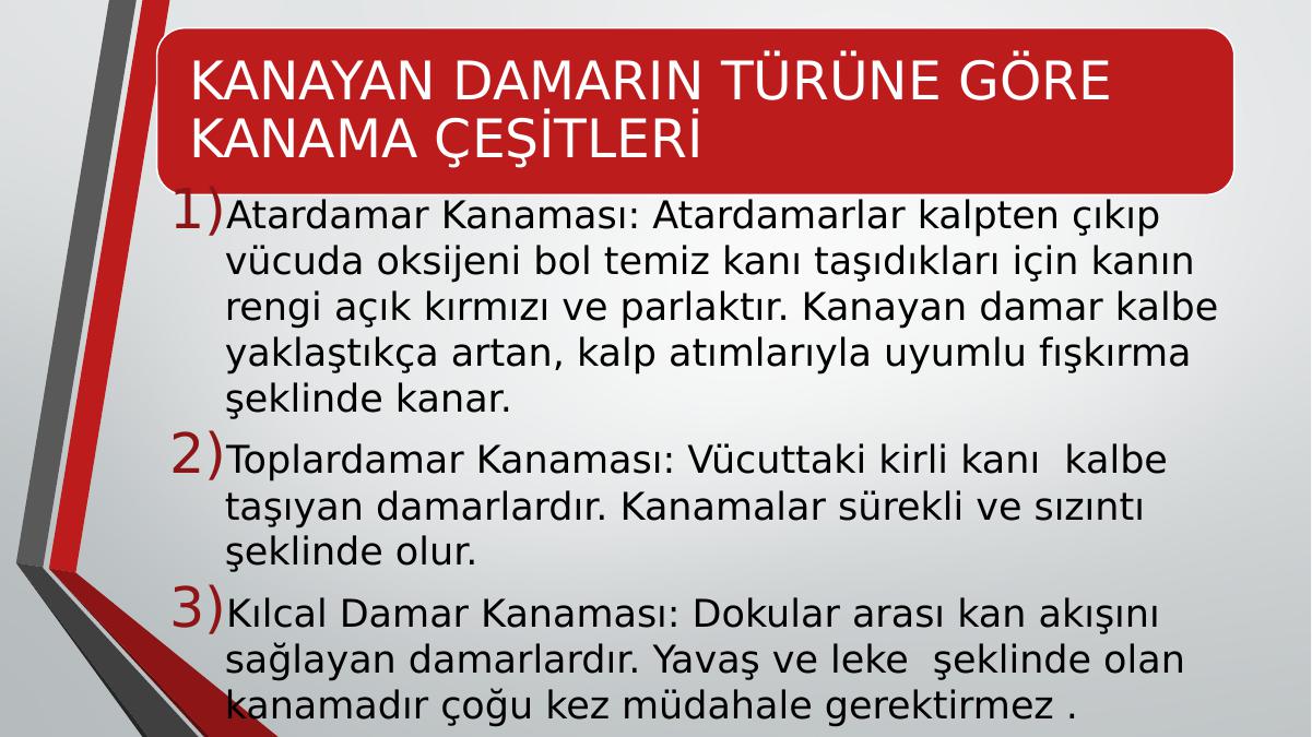 KANAYAN DAMARIN TÜRÜNE GÖRE KANAMA ÇEŞİTLERİ1)Atardamar Kanaması: Atardamarlar kalpten çıkıp vücuda oksijeni bol temiz kanı taşıdıkları için kanın rengi açık kırmızı ve parlaktır. Kanayan damar kalbe yaklaştıkça artan, kalp atımlarıyla uyumlu fışkırma şeklinde kanar. 2)Toplardamar Kanaması: Vücuttaki kirli kanı kalbe taşıyan damarlardır. Kanamalar sürekli ve sızıntı şeklinde olur.3)Kılcal Damar Kanaması: Dokular arası kan akışını sağlayan damarlardır. Yavaş ve leke şeklinde olan kanamadır çoğu kez müdahale gerektirmez .