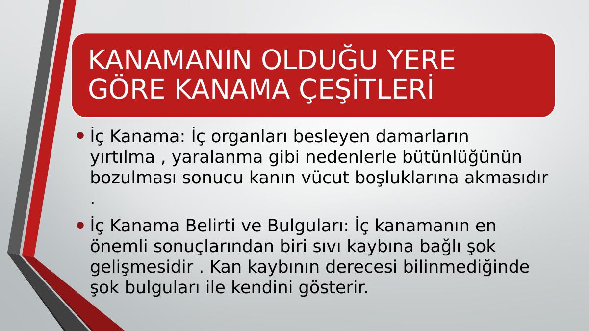 KANAMANIN OLDUĞU YERE GÖRE KANAMA ÇEŞİTLERİ• İç Kanama: İç organları besleyen damarların yırtılma , yaralanma gibi nedenlerle bütünlüğünün bozulması sonucu kanın vücut boşluklarına akmasıdır . • İç Kanama Belirti ve Bulguları: İç kanamanın en önemli sonuçlarından biri sıvı kaybına bağlı şok gelişmesidir . Kan kaybının derecesi bilinmediğinde şok bulguları ile kendini gösterir.