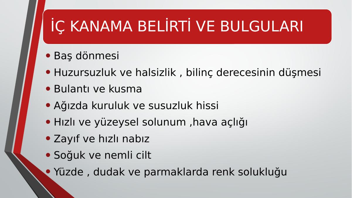 İÇ KANAMA BELİRTİ VE BULGULARI• Baş dönmesi • Huzursuzluk ve halsizlik , bilinç derecesinin düşmesi • Bulantı ve kusma • Ağızda kuruluk ve susuzluk hissi • Hızlı ve yüzeysel solunum ,hava açlığı• Zayıf ve hızlı nabız • Soğuk ve nemli cilt • Yüzde , dudak ve parmaklarda renk solukluğu