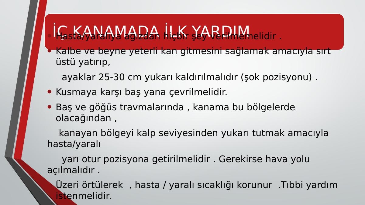 İÇ KANAMADA İLK YARDIM • Hasta/yaralıya ağızdan hiçbir şey verilmemelidir .• Kalbe ve beyne yeterli kan gitmesini sağlamak amacıyla sırt üstü yatırıp, ayaklar 25-30 cm yukarı kaldırılmalıdır (şok pozisyonu) .• Kusmaya karşı baş yana çevrilmelidir.• Baş ve göğüs travmalarında , kanama bu bölgelerde olacağından , kanayan bölgeyi kalp seviyesinden yukarı tutmak amacıyla hasta/yaralı yarı otur pozisyona getirilmelidir . Gerekirse hava yolu açılmalıdır .• Üzeri örtülerek , hasta / yaralı sıcaklığı korunur .Tıbbi yardım istenmelidir.