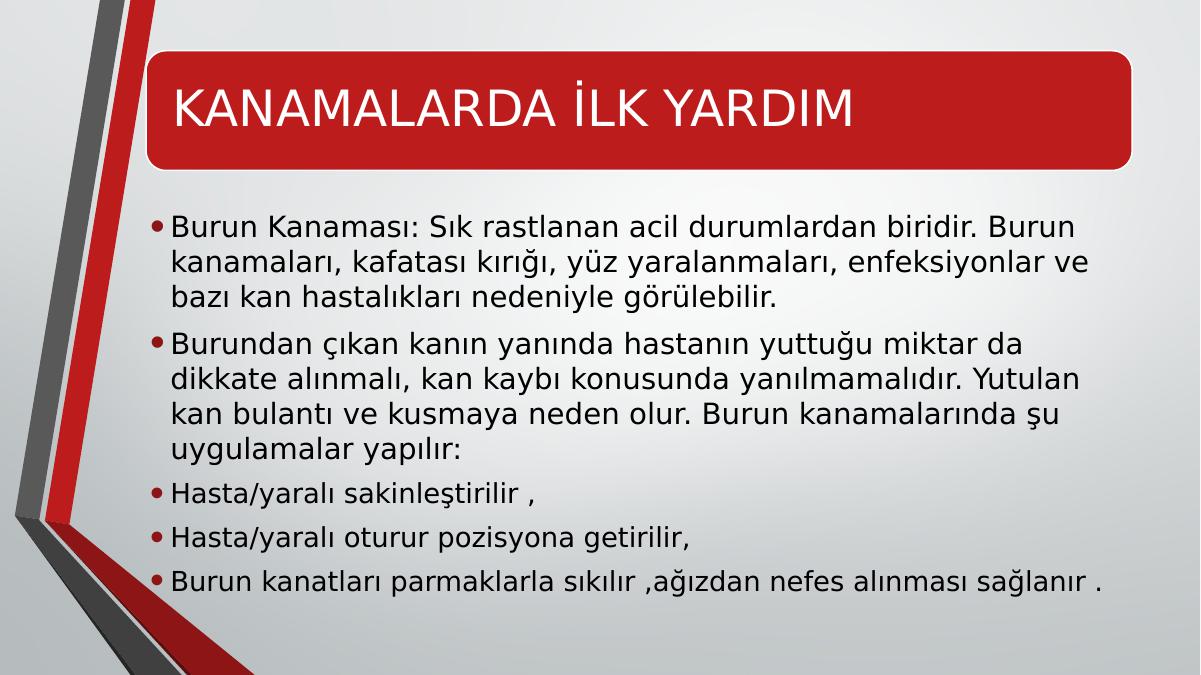 KANAMALARDA İLK YARDIM•Burun Kanaması: Sık rastlanan acil durumlardan biridir. Burun kanamaları, kafatası kırığı, yüz yaralanmaları, enfeksiyonlar ve bazı kan hastalıkları nedeniyle görülebilir. •Burundan çıkan kanın yanında hastanın yuttuğu miktar da dikkate alınmalı, kan kaybı konusunda yanılmamalıdır. Yutulan kan bulantı ve kusmaya neden olur. Burun kanamalarında şu uygulamalar yapılır: •Hasta/yaralı sakinleştirilir ,•Hasta/yaralı oturur pozisyona getirilir,• Burun kanatları parmaklarla sıkılır ,ağızdan nefes alınması sağlanır .