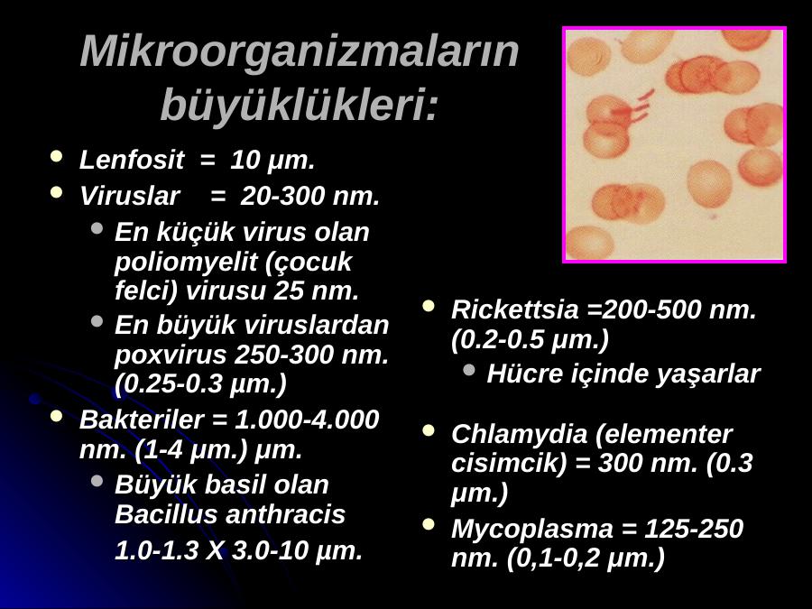 Mikroorganizmaların büyüklükleri: Lenfosit = 10 μm. Viruslar = 20-300 nm. En küçük virus olan poliomyelit (çocuk felci) virusu 25 nm. En büyük viruslardan poxvirus 250-300 nm. (0.25-0.3 µm.) Bakteriler = 1.000-4.000 nm. (1-4 μm.) μm. Büyük basil olan Bacillus anthracis 1.0-1.3 X 3.0-10 µm. Rickettsia =200-500 nm. (0.2-0.5 μm.) Hücre içinde yaşarlar Chlamydia (elementer cisimcik) = 300 nm. (0.3 μm.) Mycoplasma = 125-250 nm. (0,1-0,2 μm.)