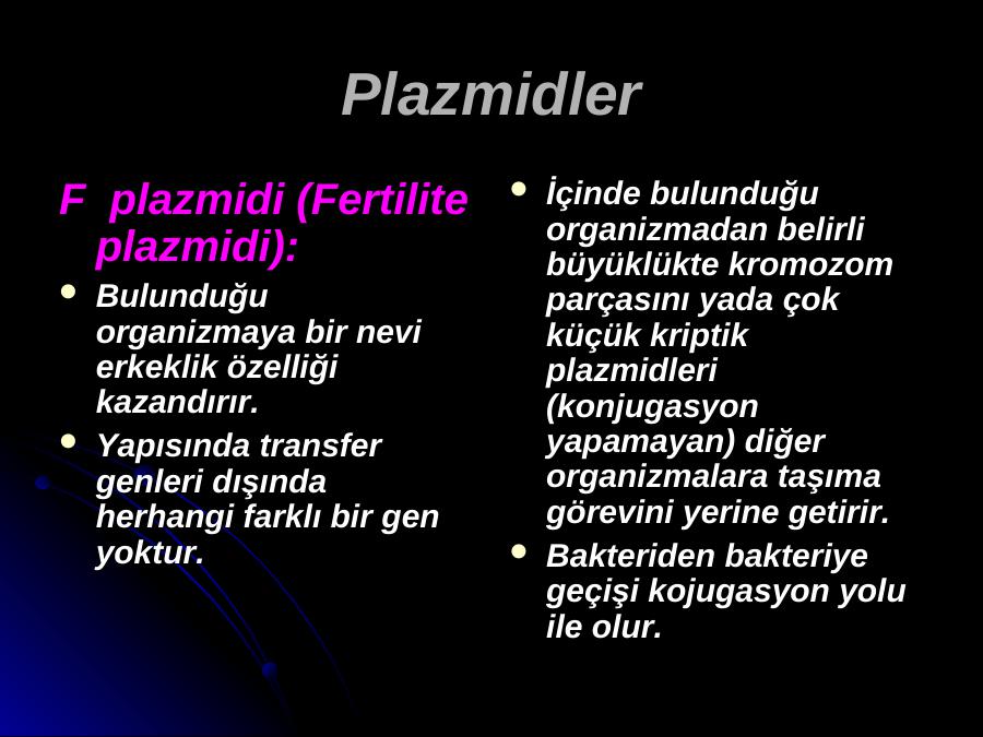 PlazmidlerF plazmidi (Fertilite plazmidi): Bulunduğu organizmaya bir nevi erkeklik özelliği kazandırır. Yapısında transfer genleri dışında herhangi farklı bir gen yoktur. İçinde bulunduğu organizmadan belirli büyüklükte kromozom parçasını yada çok küçük kriptik plazmidleri (konjugasyon yapamayan) diğer organizmalara taşıma görevini yerine getirir. Bakteriden bakteriye geçişi kojugasyon yolu ile olur.