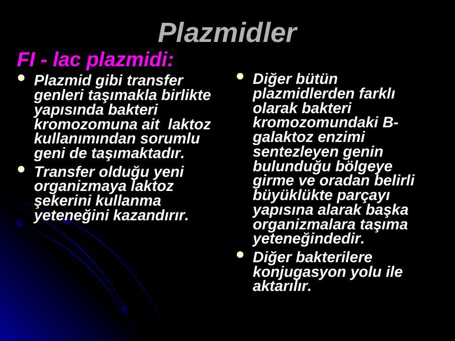PlazmidlerFI - lac plazmidi: Plazmid gibi transfer genleri taşımakla birlikte yapısında bakteri kromozomuna ait laktoz kullanımından sorumlu geni de taşımaktadır. Transfer olduğu yeni organizmaya laktoz şekerini kullanma yeteneğini kazandırır. Diğer bütün plazmidlerden farklı olarak bakteri kromozomundaki B-galaktoz enzimi sentezleyen genin bulunduğu bölgeye girme ve oradan belirli büyüklükte parçayı yapısına alarak başka organizmalara taşıma yeteneğindedir. Diğer bakterilere konjugasyon yolu ile aktarılır.