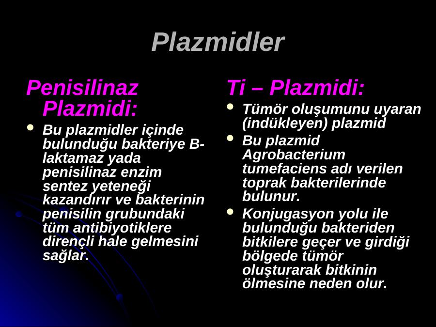 PlazmidlerPenisilinaz Plazmidi: Bu plazmidler içinde bulunduğu bakteriye B-laktamaz yada penisilinaz enzim sentez yeteneği kazandırır ve bakterinin penisilin grubundaki tüm antibiyotiklere dirençli hale gelmesini sağlar. Ti – Plazmidi: Tümör oluşumunu uyaran (indükleyen) plazmid Bu plazmid Agrobacterium tumefaciens adı verilen toprak bakterilerinde bulunur. Konjugasyon yolu ile bulunduğu bakteriden bitkilere geçer ve girdiği bölgede tümör oluşturarak bitkinin ölmesine neden olur.