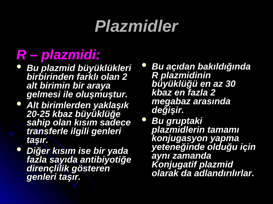 PlazmidlerR – plazmidi: Bu plazmid büyüklükleri birbirinden farklı olan 2 alt birimin bir araya gelmesi ile oluşmuştur. Alt birimlerden yaklaşık 20-25 kbaz büyüklüğe sahip olan kısım sadece transferle ilgili genleri taşır. Diğer kısım ise bir yada fazla sayıda antibiyotiğe dirençlilik gösteren genleri taşır. Bu açıdan bakıldığında R plazmidinin büyüklüğü en az 30 kbaz en fazla 2 megabaz arasında değişir. Bu gruptaki plazmidlerin tamamı konjugasyon yapma yeteneğinde olduğu için aynı zamanda Konjugatif plazmid olarak da adlandırılırlar.