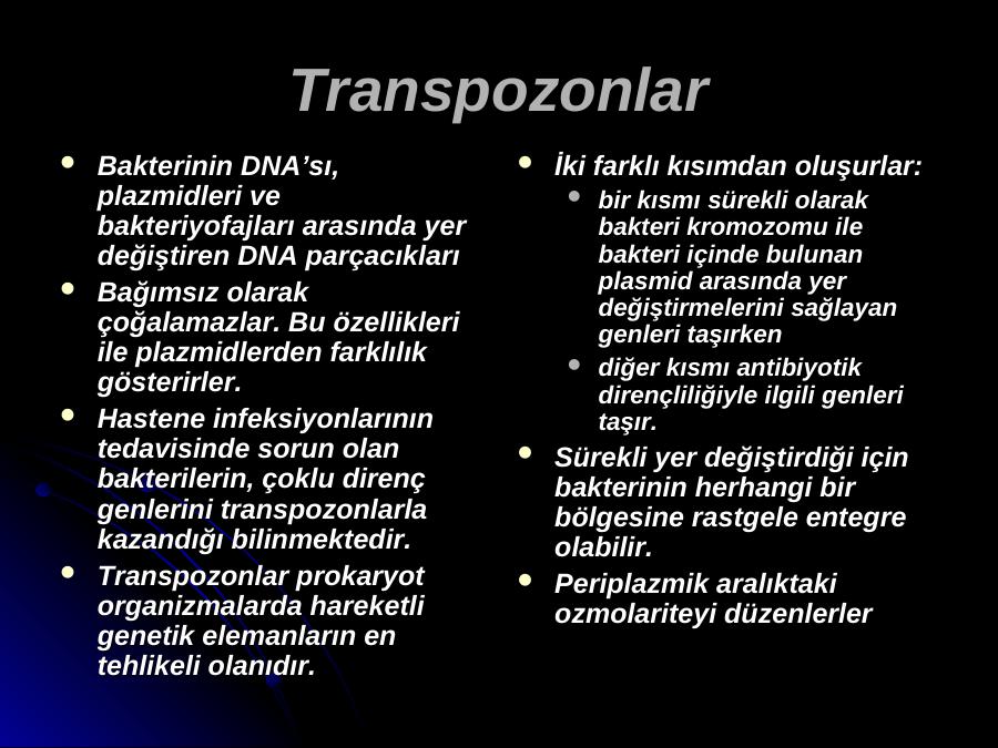 Transpozonlar Bakterinin DNA’sı, plazmidleri ve bakteriyofajları arasında yer değiştiren DNA parçacıkları Bağımsız olarak çoğalamazlar. Bu özellikleri ile plazmidlerden farklılık gösterirler. Hastene infeksiyonlarının tedavisinde sorun olan bakterilerin, çoklu direnç genlerini transpozonlarla kazandığı bilinmektedir. Transpozonlar prokaryot organizmalarda hareketli genetik elemanların en tehlikeli olanıdır. İki farklı kısımdan oluşurlar: bir kısmı sürekli olarak bakteri kromozomu ile bakteri içinde bulunan plasmid arasında yer değiştirmelerini sağlayan genleri taşırken diğer kısmı antibiyotik dirençliliğiyle ilgili genleri taşır. Sürekli yer değiştirdiği için bakterinin herhangi bir bölgesine rastgele entegre olabilir. Periplazmik aralıktaki ozmolariteyi düzenlerler