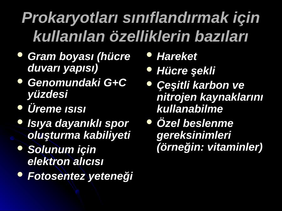 Prokaryotları sınıflandırmak için kullanılan özelliklerin bazıları Gram boyası (hücre duvarı yapısı) Genomundaki G+C yüzdesi Üreme ısısı Isıya dayanıklı spor oluşturma kabiliyeti Solunum için elektron alıcısı Fotosentez yeteneği Hareket Hücre şekli Çeşitli karbon ve nitrojen kaynaklarını kullanabilme Özel beslenme gereksinimleri (örneğin: vitaminler)