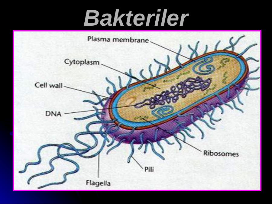 Bakterilerin yapısı (Morfoloji)1. Hücre duvarı: sert yapıdır; sitoplazma membranına destek sağlar, ozmotik lizisden korur 2. Sitoplazmik membran Sitoplazmik membran lipidleri, bakteri ve eukarya’da ester bağlantısı ile birleşir (RCOOR’); archaea’da ise eter bağlantısı ile birleşir (ROR’). 3. Ribozomlar 4. İnklüzyon cisimcikleri: C, N, S, P’lu bileşiklerden oluşan depo maddelerini ihtiva eden cisimler 5. Nükleoid: hakiki nükleus yoktur, tek bir DNA molekülü nükleus işini görür. Agrege formdaki bu DNA’ya nükleoid denir ve eukaryotlardaki kromozoma karşılık gelir 6. Flagellum: bazı bakterilerde hareketi sağlayan kirpik