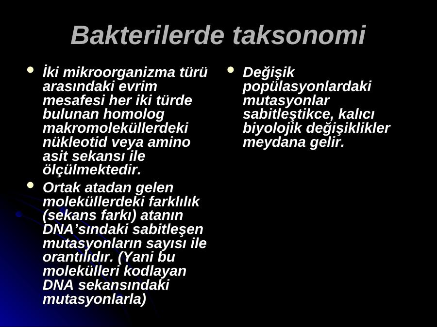 Bakterilerde taksonomi İki mikroorganizma türü arasındaki evrim mesafesi her iki türde bulunan homolog makromoleküllerdeki nükleotid veya amino asit sekansı ile ölçülmektedir. Ortak atadan gelen moleküllerdeki farklılık (sekans farkı) atanın DNA’sındaki sabitleşen mutasyonların sayısı ile orantılıdır. (Yani bu molekülleri kodlayan DNA sekansındaki mutasyonlarla) Değişik popülasyonlardaki mutasyonlar sabitleştikce, kalıcı biyolojik değişiklikler meydana gelir.