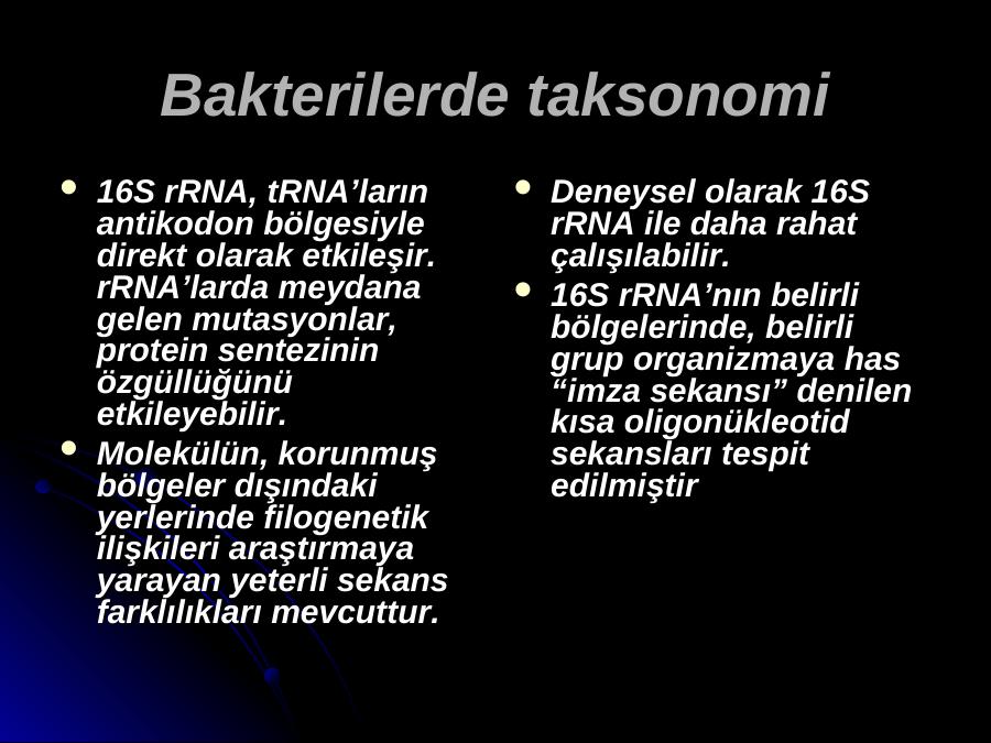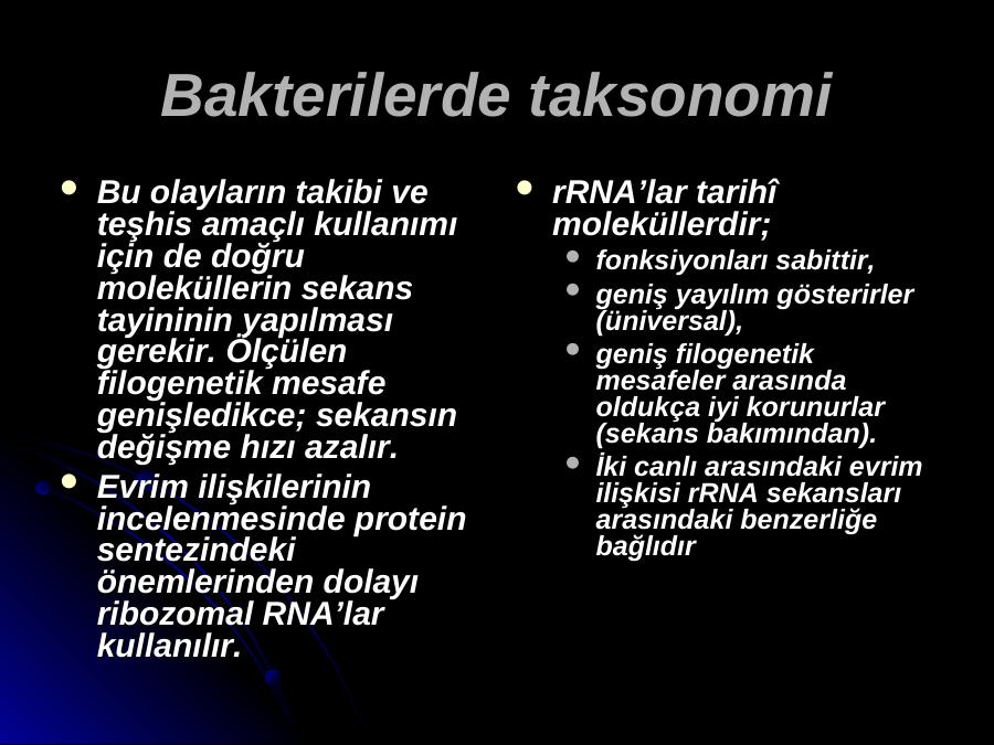 Bakterilerde taksonomi Bu olayların takibi ve teşhis amaçlı kullanımı için de doğru moleküllerin sekans tayininin yapılması gerekir. Ölçülen filogenetik mesafe genişledikce; sekansın değişme hızı azalır. Evrim ilişkilerinin incelenmesinde protein sentezindeki önemlerinden dolayı ribozomal RNA’lar kullanılır. rRNA’lar tarihî moleküllerdir; fonksiyonları sabittir, geniş yayılım gösterirler (üniversal), geniş filogenetik mesafeler arasında oldukça iyi korunurlar (sekans bakımından). İki canlı arasındaki evrim ilişkisi rRNA sekansları arasındaki benzerliğe bağlıdır