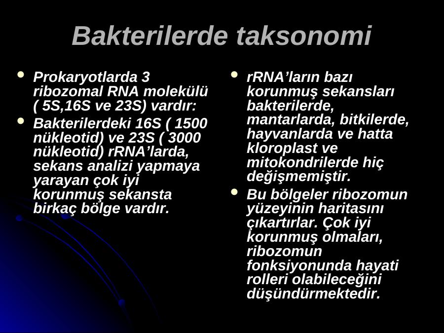 Bakterilerde taksonomi Prokaryotlarda 3 ribozomal RNA molekülü ( 5S,16S ve 23S) vardır: Bakterilerdeki 16S ( 1500 nükleotid) ve 23S ( 3000 nükleotid) rRNA’larda, sekans analizi yapmaya yarayan çok iyi korunmuş sekansta birkaç bölge vardır. rRNA’ların bazı korunmuş sekansları bakterilerde, mantarlarda, bitkilerde, hayvanlarda ve hatta kloroplast ve mitokondrilerde hiç değişmemiştir. Bu bölgeler ribozomun yüzeyinin haritasını çıkartırlar. Çok iyi korunmuş olmaları, ribozomun fonksiyonunda hayati rolleri olabileceğini düşündürmektedir.