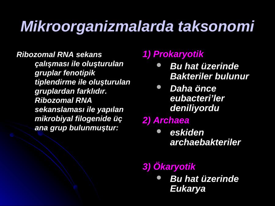 Mikroorganizmalarda taksonomiRibozomal RNA sekans çalışması ile oluşturulan gruplar fenotipik tiplendirme ile oluşturulan gruplardan farklıdır. Ribozomal RNA sekanslaması ile yapılan mikrobiyal filogenide üç ana grup bulunmuştur: 1) Prokaryotik Bu hat üzerinde Bakteriler bulunur Daha önce eubacteri’ler deniliyordu2) Archaea eskiden archaebakteriler3) Ökaryotik Bu hat üzerinde Eukarya
