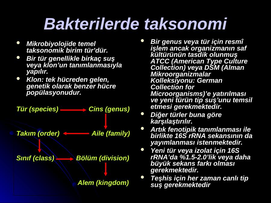 Bakterilerde taksonomi Mikrobiyolojide temel taksonomik birim tür’dür. Bir tür genellikle birkaç suş veya klon’un tanımlanmasıyla yapılır. Klon: tek hücreden gelen, genetik olarak benzer hücre popülasyonudur. Tür (species) Cins (genus) Takım (order) Aile (family)Sınıf (class) Bölüm (division) Alem (kingdom) Bir genus veya tür için resmî işlem ancak organizmanın saf kültürünün tasdik olunmuş ATCC (American Type Culture Collection) veya DSM (Alman Mikroorganizmalar Kolleksiyonu: German Collection for Microorganisms)’e yatırılması ve yeni türün tip suş’unu temsil etmesi gerekmektedir. Diğer türler buna göre karşılaştırılır. Artık fenotipik tanımlanması ile birlikte 16S rRNA sekansının da yayımlanması istenmektedir. Yeni tür veya izolat için 16S rRNA’da %1.5-2.0’lik veya daha büyük sekans farkı olması gerekmektedir. Teşhis için her zaman canlı tip suş gerekmektedir