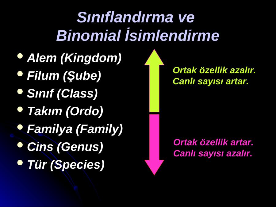 Sınıflandırma ve Binomial İsimlendirmeAlem (Kingdom)Filum (Şube)Sınıf (Class)Takım (Ordo)Familya (Family)Cins (Genus)Tür (Species)Ortak özellik azalır.Canlı sayısı artar.Ortak özellik artar.Canlı sayısı azalır.