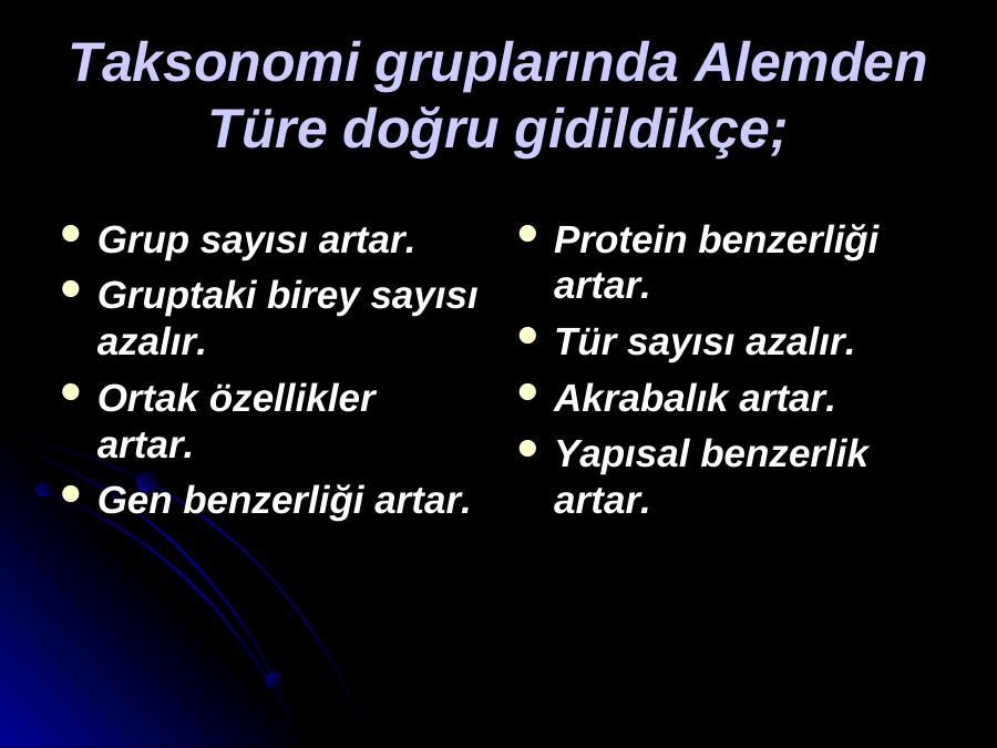 Taksonomi gruplarında Alemden Türe doğru gidildikçe; Grup sayısı artar. Gruptaki birey sayısı azalır. Ortak özellikler artar. Gen benzerliği artar. Protein benzerliği artar. Tür sayısı azalır. Akrabalık artar. Yapısal benzerlik artar.