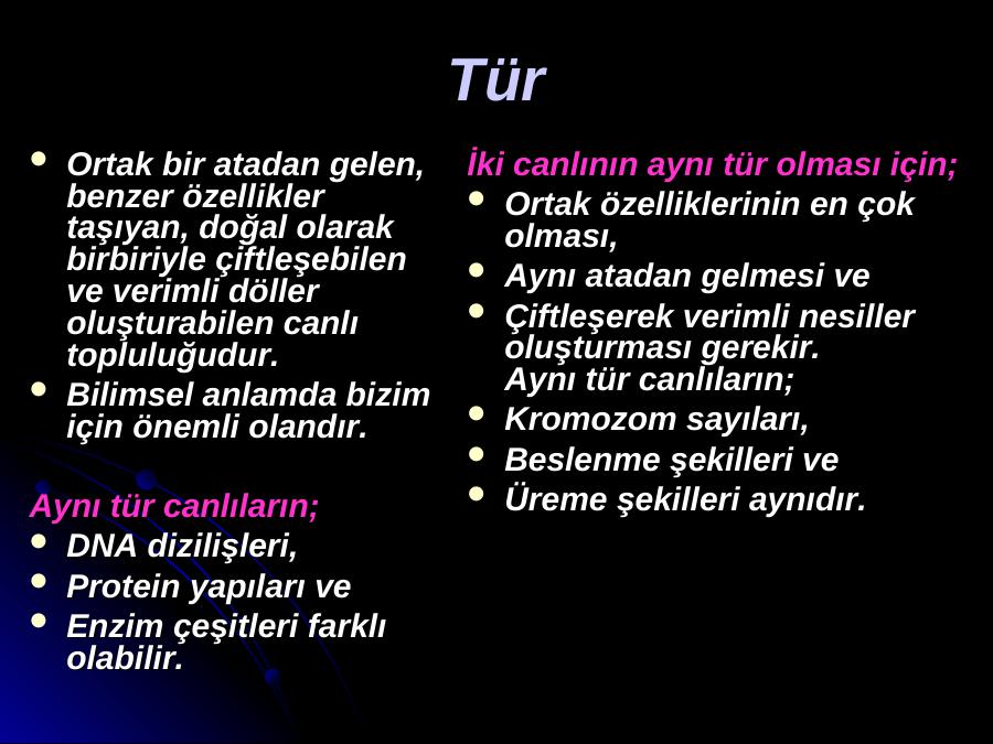 Tür Ortak bir atadan gelen, benzer özellikler taşıyan, doğal olarak birbiriyle çiftleşebilen ve verimli döller oluşturabilen canlı topluluğudur. Bilimsel anlamda bizim için önemli olandır.Aynı tür canlıların; DNA dizilişleri, Protein yapıları ve Enzim çeşitleri farklı olabilir.İki canlının aynı tür olması için; Ortak özelliklerinin en çok olması, Aynı atadan gelmesi ve Çiftleşerek verimli nesiller oluşturması gerekir.Aynı tür canlıların; Kromozom sayıları, Beslenme şekilleri ve Üreme şekilleri aynıdır.