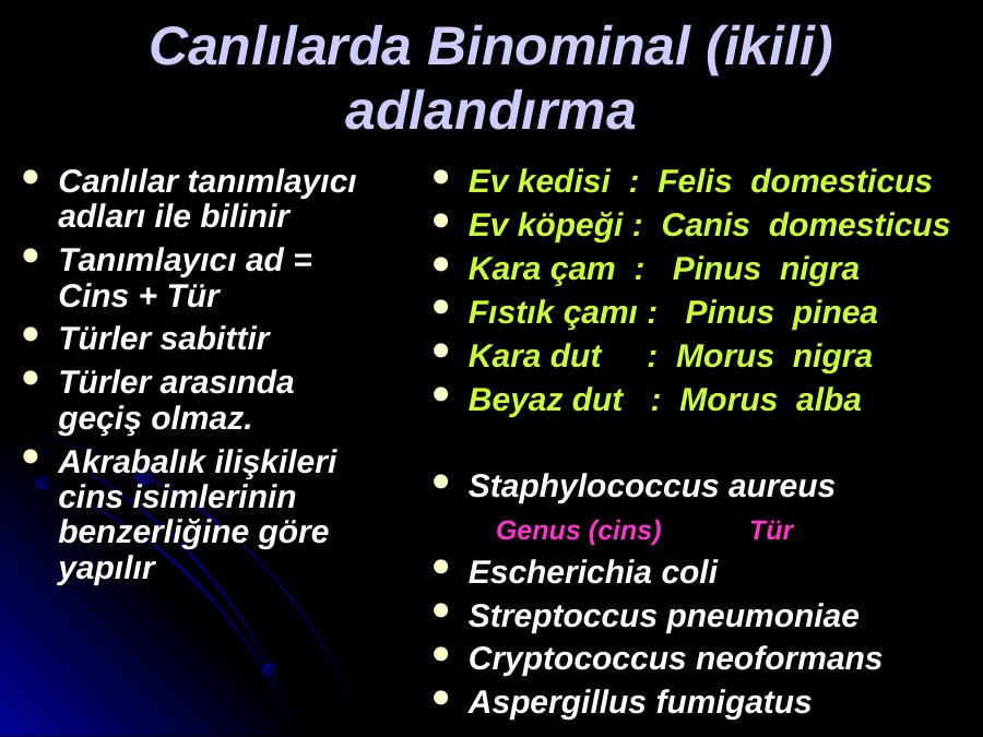 Canlılarda Binominal (ikili) adlandırma Canlılar tanımlayıcı adları ile bilinir Tanımlayıcı ad = Cins + Tür Türler sabittir Türler arasında geçiş olmaz. Akrabalık ilişkileri cins isimlerinin benzerliğine göre yapılır Ev kedisi : Felis domesticus Ev köpeği : Canis domesticus Kara çam : Pinus nigra Fıstık çamı : Pinus pinea Kara dut : Morus nigra Beyaz dut : Morus alba Staphylococcus aureus Genus (cins) Tür Escherichia coli Streptoccus pneumoniae Cryptococcus neoformans Aspergillus fumigatus