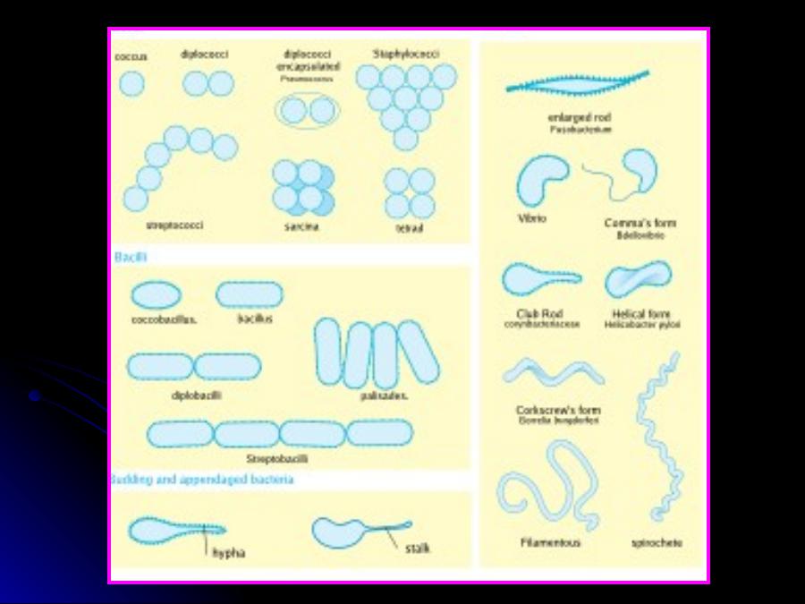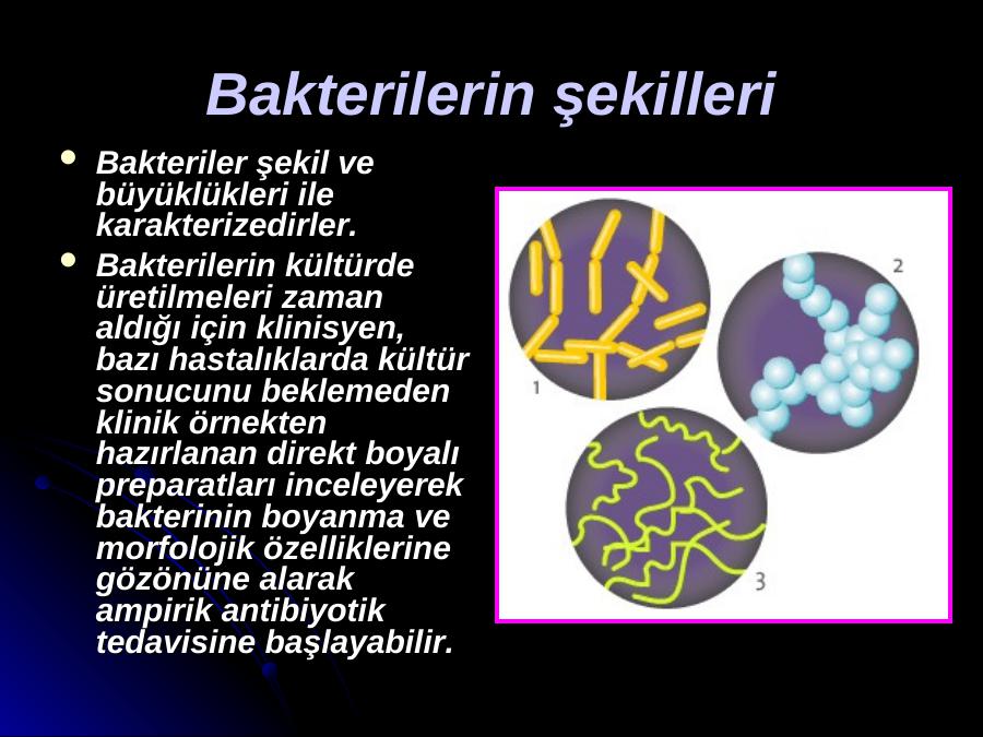 Bakterilerin şekilleri Bakteriler şekil ve büyüklükleri ile karakterizedirler. Bakterilerin kültürde üretilmeleri zaman aldığı için klinisyen, bazı hastalıklarda kültür sonucunu beklemeden klinik örnekten hazırlanan direkt boyalı preparatları inceleyerek bakterinin boyanma ve morfolojik özelliklerine gözönüne alarak ampirik antibiyotik tedavisine başlayabilir.