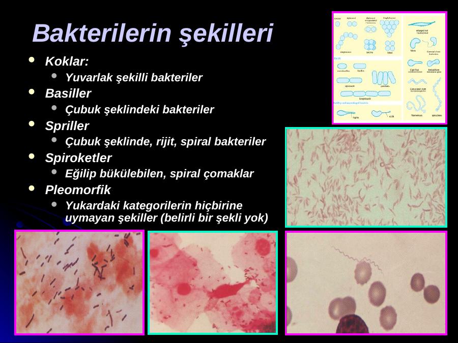 Bakterilerin şekilleri Koklar: Yuvarlak şekilli bakteriler Basiller Çubuk şeklindeki bakteriler Spriller Çubuk şeklinde, rijit, spiral bakteriler Spiroketler Eğilip bükülebilen, spiral çomaklar Pleomorfik Yukardaki kategorilerin hiçbirine uymayan şekiller (belirli bir şekli yok)