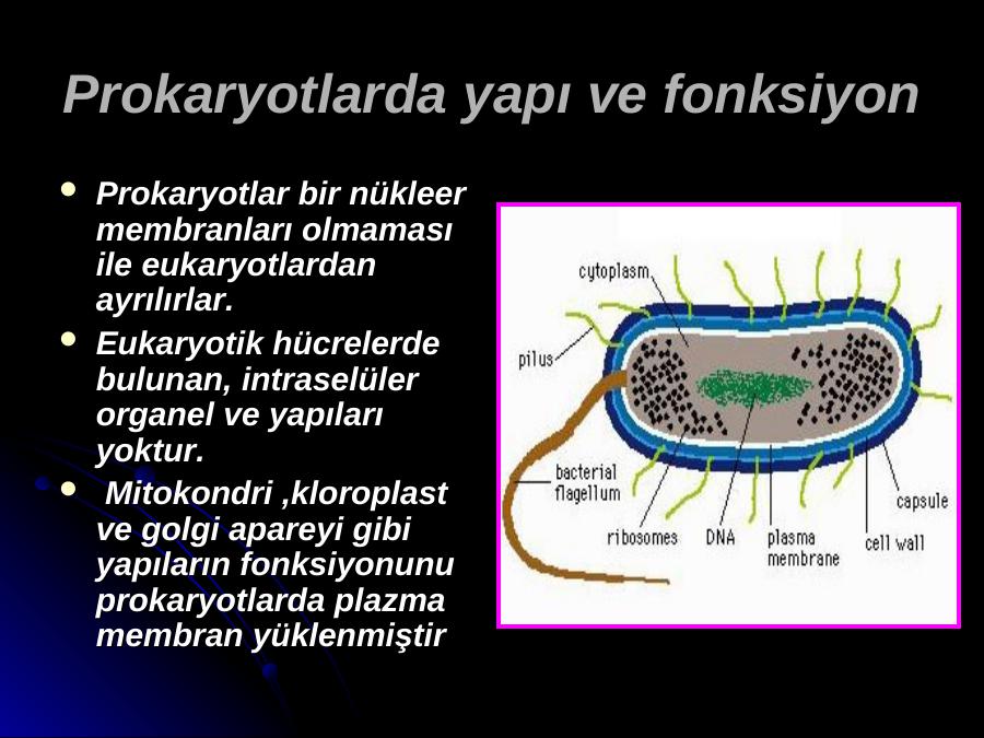 Prokaryotlarda yapı ve fonksiyon Prokaryotlar bir nükleer membranları olmaması ile eukaryotlardan ayrılırlar. Eukaryotik hücrelerde bulunan, intraselüler organel ve yapıları yoktur. Mitokondri ,kloroplast ve golgi apareyi gibi yapıların fonksiyonunu prokaryotlarda plazma membran yüklenmiştir