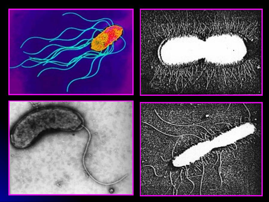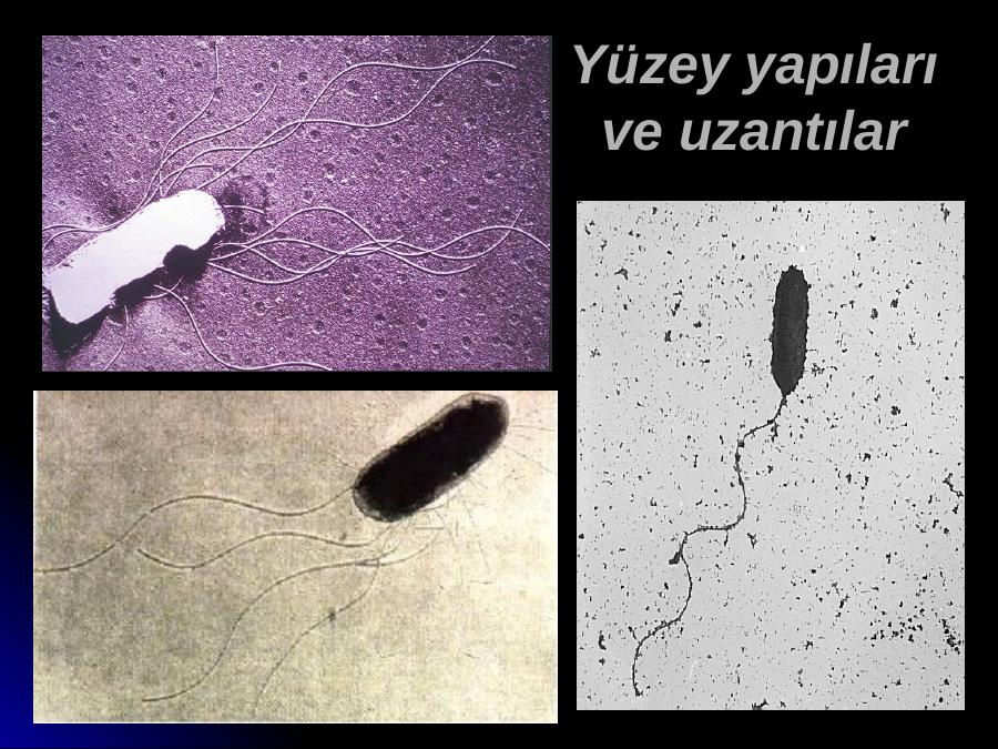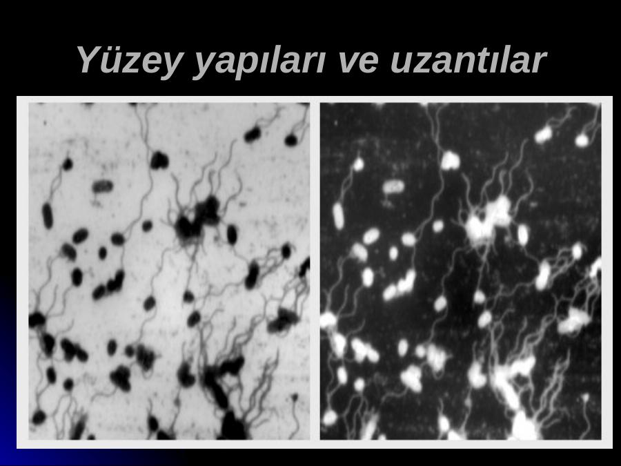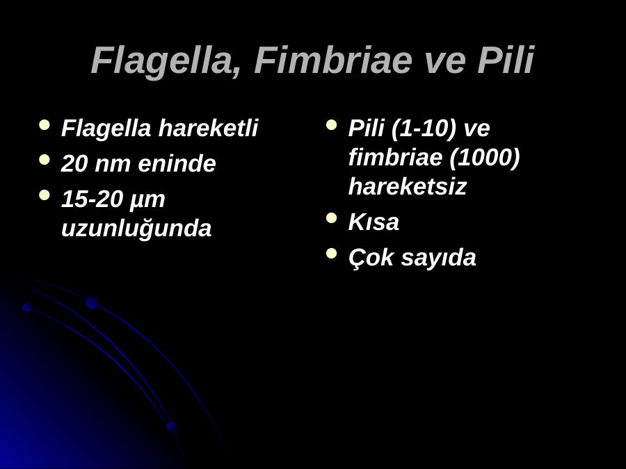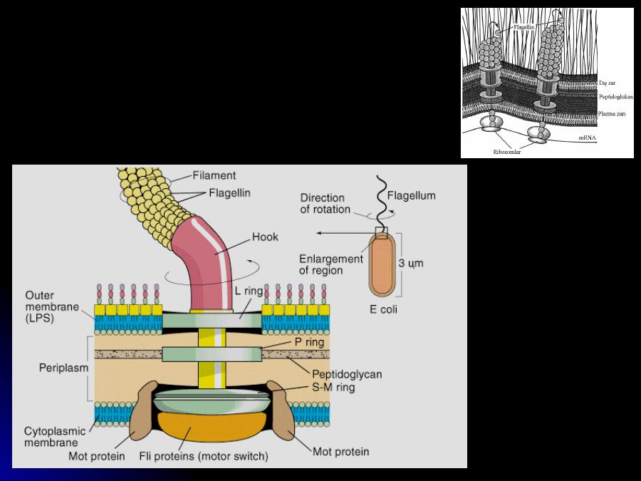 Flagella, Fimbriae ve Pili Flagella hareketli 20 nm eninde 15-20 µm uzunluğunda Pili (1-10) ve fimbriae (1000) hareketsiz Kısa Çok sayıda