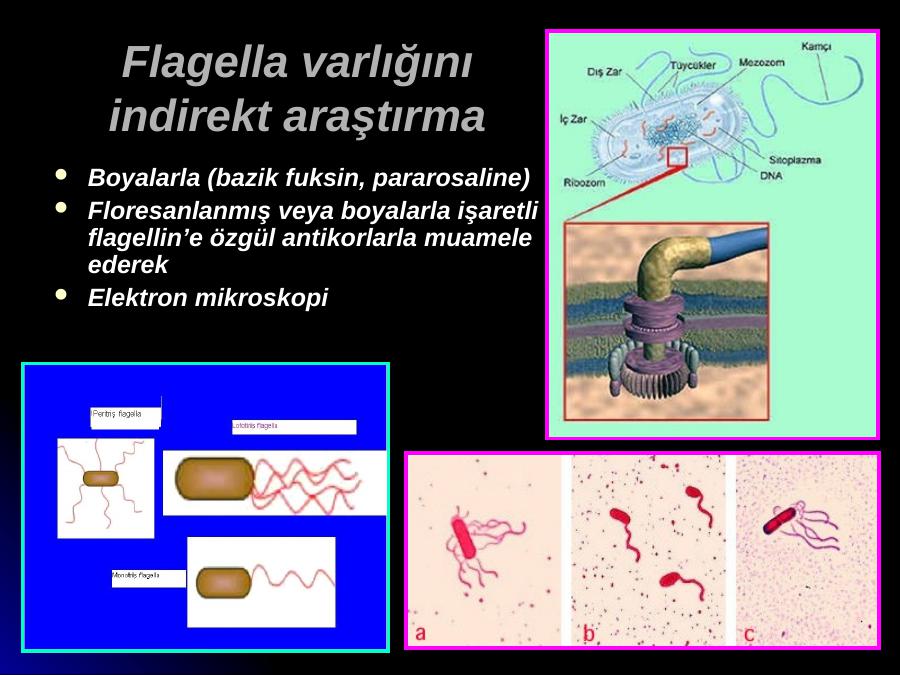 Flagella varlığını indirekt araştırma Boyalarla (bazik fuksin, pararosaline) Floresanlanmış veya boyalarla işaretli flagellin’e özgül antikorlarla muamele ederek Elektron mikroskopi