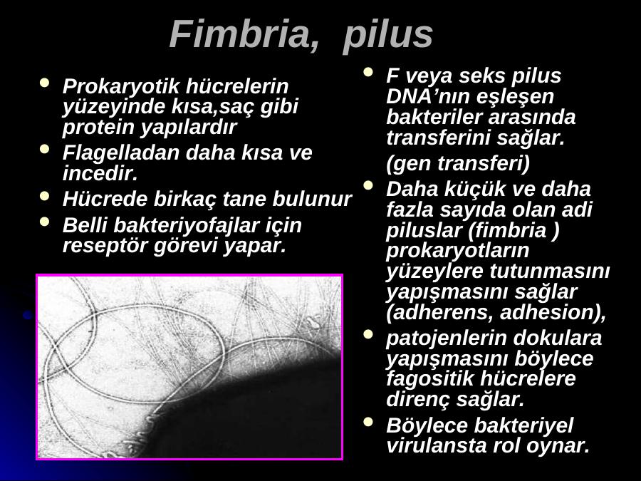 Fimbria, pilus Prokaryotik hücrelerin yüzeyinde kısa,saç gibi protein yapılardır Flagelladan daha kısa ve incedir. Hücrede birkaç tane bulunur Belli bakteriyofajlar için reseptör görevi yapar. F veya seks pilus DNA’nın eşleşen bakteriler arasında transferini sağlar. (gen transferi) Daha küçük ve daha fazla sayıda olan adi piluslar (fimbria ) prokaryotların yüzeylere tutunmasını yapışmasını sağlar (adherens, adhesion), patojenlerin dokulara yapışmasını böylece fagositik hücrelere direnç sağlar. Böylece bakteriyel virulansta rol oynar.
