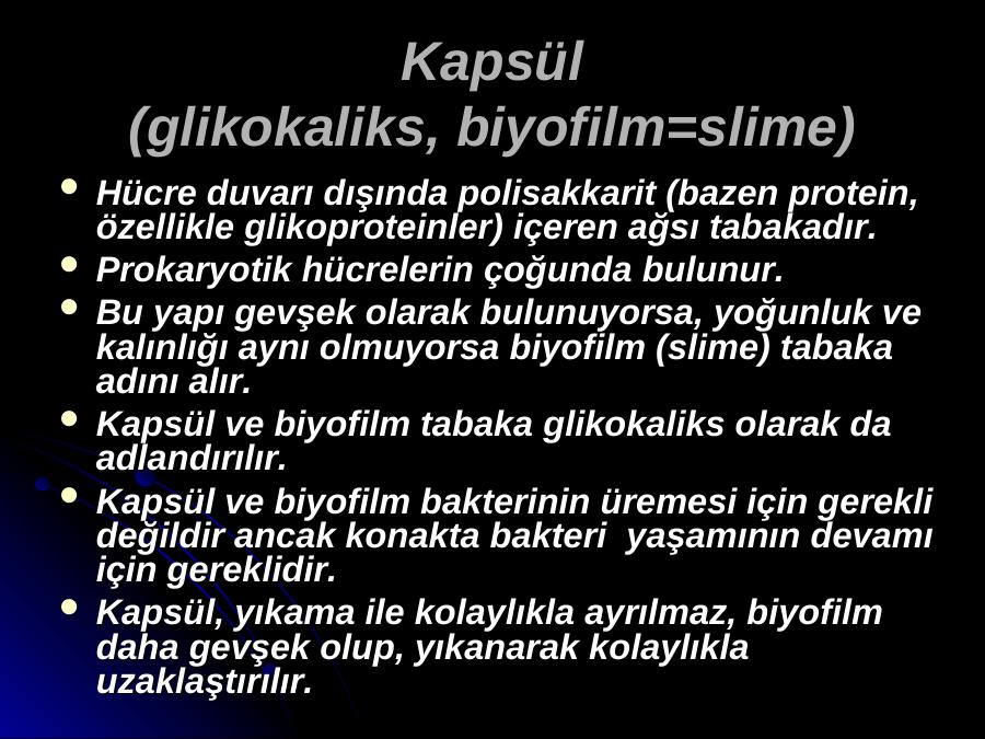 Kapsül(glikokaliks, biyofilm=slime) Hücre duvarı dışında polisakkarit (bazen protein, özellikle glikoproteinler) içeren ağsı tabakadır. Prokaryotik hücrelerin çoğunda bulunur. Bu yapı gevşek olarak bulunuyorsa, yoğunluk ve kalınlığı aynı olmuyorsa biyofilm (slime) tabaka adını alır. Kapsül ve biyofilm tabaka glikokaliks olarak da adlandırılır. Kapsül ve biyofilm bakterinin üremesi için gerekli değildir ancak konakta bakteri yaşamının devamı için gereklidir. Kapsül, yıkama ile kolaylıkla ayrılmaz, biyofilm daha gevşek olup, yıkanarak kolaylıkla uzaklaştırılır.