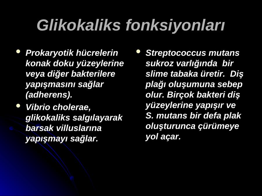 Glikokaliks fonksiyonları Prokaryotik hücrelerin konak doku yüzeylerine veya diğer bakterilere yapışmasını sağlar (adherens). Vibrio cholerae, glikokaliks salgılayarak barsak villuslarına yapışmayı sağlar. Streptococcus mutans sukroz varlığında bir slime tabaka üretir. Diş plağı oluşumuna sebep olur. Birçok bakteri diş yüzeylerine yapışır ve S. mutans bir defa plak oluşturunca çürümeye yol açar.