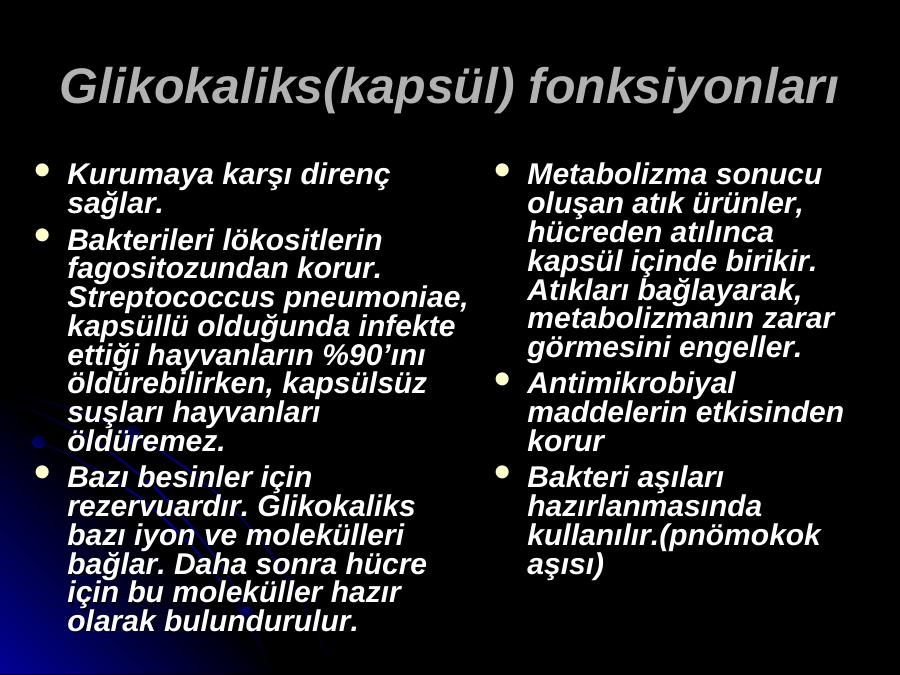 Glikokaliks(kapsül) fonksiyonları Kurumaya karşı direnç sağlar. Bakterileri lökositlerin fagositozundan korur. Streptococcus pneumoniae, kapsüllü olduğunda infekte ettiği hayvanların %90’ını öldürebilirken, kapsülsüz suşları hayvanları öldüremez. Bazı besinler için rezervuardır. Glikokaliks bazı iyon ve molekülleri bağlar. Daha sonra hücre için bu moleküller hazır olarak bulundurulur. Metabolizma sonucu oluşan atık ürünler, hücreden atılınca kapsül içinde birikir. Atıkları bağlayarak, metabolizmanın zarar görmesini engeller. Antimikrobiyal maddelerin etkisinden korur Bakteri aşıları hazırlanmasında kullanılır.(pnömokok aşısı)
