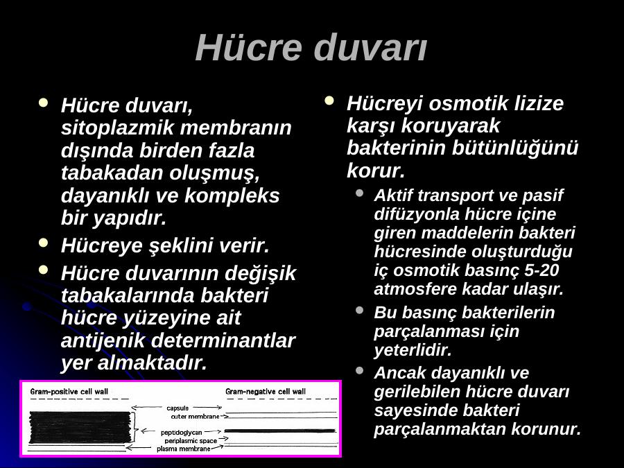 Hücre duvarı Hücre duvarı, sitoplazmik membranın dışında birden fazla tabakadan oluşmuş, dayanıklı ve kompleks bir yapıdır. Hücreye şeklini verir. Hücre duvarının değişik tabakalarında bakteri hücre yüzeyine ait antijenik determinantlar yer almaktadır. Hücreyi osmotik lizize karşı koruyarak bakterinin bütünlüğünü korur. Aktif transport ve pasif difüzyonla hücre içine giren maddelerin bakteri hücresinde oluşturduğu iç osmotik basınç 5-20 atmosfere kadar ulaşır. Bu basınç bakterilerin parçalanması için yeterlidir. Ancak dayanıklı ve gerilebilen hücre duvarı sayesinde bakteri parçalanmaktan korunur.