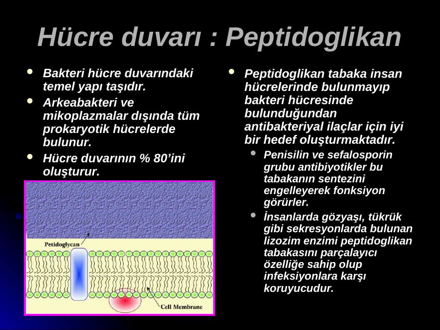 Hücre duvarı : Peptidoglikan Bakteri hücre duvarındaki temel yapı taşıdır. Arkeabakteri ve mikoplazmalar dışında tüm prokaryotik hücrelerde bulunur. Hücre duvarının % 80’ini oluşturur. Peptidoglikan tabaka insan hücrelerinde bulunmayıp bakteri hücresinde bulunduğundan antibakteriyal ilaçlar için iyi bir hedef oluşturmaktadır. Penisilin ve sefalosporin grubu antibiyotikler bu tabakanın sentezini engelleyerek fonksiyon görürler. İnsanlarda gözyaşı, tükrük gibi sekresyonlarda bulunan lizozim enzimi peptidoglikan tabakasını parçalayıcı özelliğe sahip olup infeksiyonlara karşı koruyucudur.