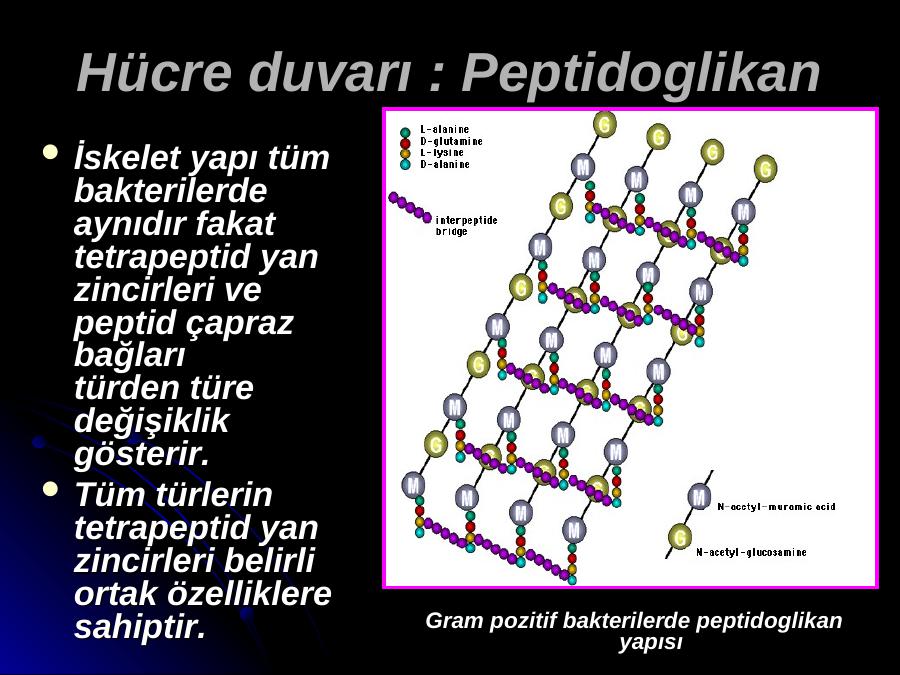Hücre duvarı : Peptidoglikan İskelet yapı tüm bakterilerde aynıdır fakat tetrapeptid yan zincirleri ve peptid çapraz bağları türden türe değişiklik gösterir. Tüm türlerin tetrapeptid yan zincirleri belirli ortak özelliklere sahiptir. Gram pozitif bakterilerde peptidoglikan yapısı
