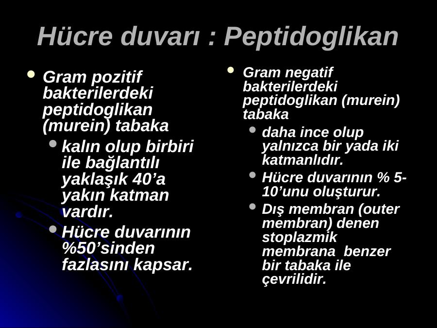 Hücre duvarı : Peptidoglikan Gram pozitif bakterilerdeki peptidoglikan (murein) tabaka kalın olup birbiri ile bağlantılı yaklaşık 40’a yakın katman vardır. Hücre duvarının %50’sinden fazlasını kapsar. Gram negatif bakterilerdeki peptidoglikan (murein) tabaka daha ince olup yalnızca bir yada iki katmanlıdır. Hücre duvarının % 5-10’unu oluşturur. Dış membran (outer membran) denen stoplazmik membrana benzer bir tabaka ile çevrilidir.