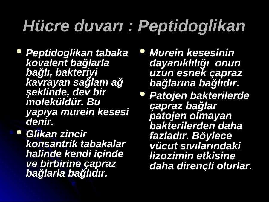 Hücre duvarı : Peptidoglikan Peptidoglikan tabaka kovalent bağlarla bağlı, bakteriyi kavrayan sağlam ağ şeklinde, dev bir moleküldür. Bu yapıya murein kesesi denir. Glikan zincir konsantrik tabakalar halinde kendi içinde ve birbirine çapraz bağlarla bağlıdır. Murein kesesinin dayanıklılığı onun uzun esnek çapraz bağlarına bağlıdır. Patojen bakterilerde çapraz bağlar patojen olmayan bakterilerden daha fazladır. Böylece vücut sıvılarındaki lizozimin etkisine daha dirençli olurlar.