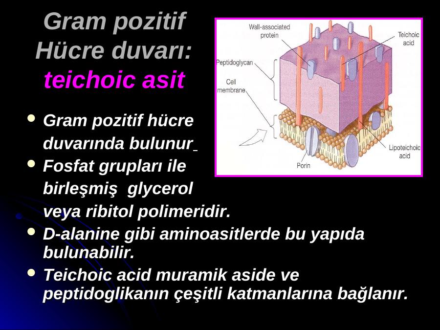 Gram pozitif Hücre duvarı:teichoic asit Gram pozitif hücre duvarında bulunur Fosfat grupları ile birleşmiş glycerol veya ribitol polimeridir. D-alanine gibi aminoasitlerde bu yapıda bulunabilir. Teichoic acid muramik aside ve peptidoglikanın çeşitli katmanlarına bağlanır.
