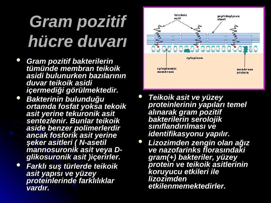 Gram pozitif hücre duvarı Gram pozitif bakterilerin tümünde membran teikoik asidi bulunurken bazılarının duvar teikoik asidi içermediği görülmektedir. Bakterinin bulunduğu ortamda fosfat yoksa tekoik asit yerine tekuronik asit sentezlenir. Bunlar teikoik aside benzer polimerlerdir ancak fosforik asit yerine şeker asitleri ( N-asetil mannosuronik asit veya D-glikosuronik asit )içerirler. Farklı suş türlerde teikoik asit yapısı ve yüzey proteinlerinde farklılıklar vardır. Teikoik asit ve yüzey proteinlerinin yapıları temel alınarak gram pozitif bakterilerin serolojik sınıflandırılması ve identifikasyonu yapılır. Lizozimden zengin olan ağız ve nazofarinks florasındaki gram(+) bakteriler, yüzey protein ve teikoik asitlerinin koruyucu etkileri ile lizozimden etkilenmemektedirler.