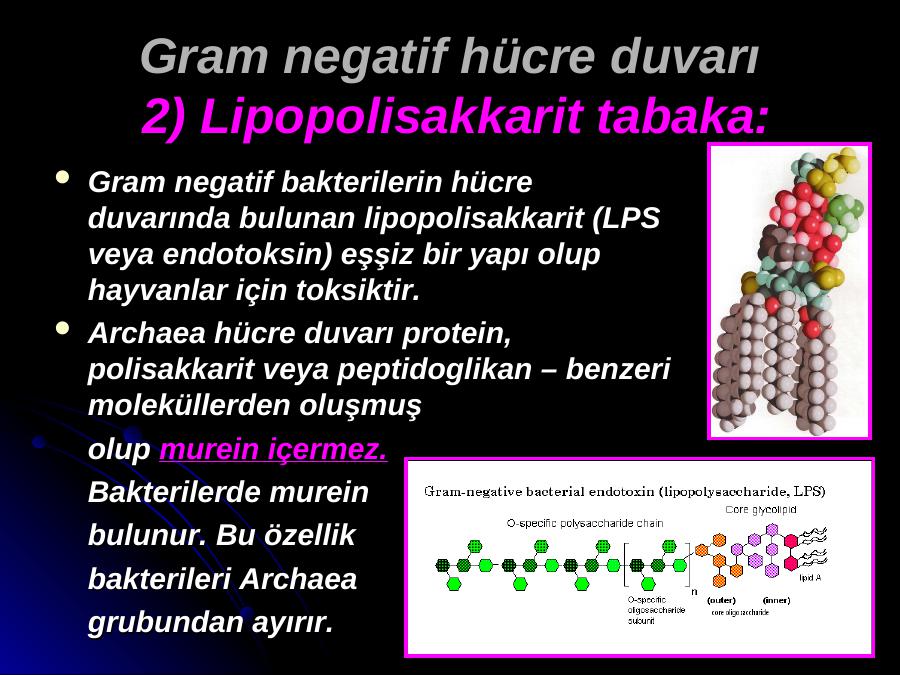 Gram negatif hücre duvarı 2) Lipopolisakkarit tabaka: Gram negatif bakterilerin hücre duvarında bulunan lipopolisakkarit (LPS veya endotoksin) eşşiz bir yapı olup hayvanlar için toksiktir. Archaea hücre duvarı protein, polisakkarit veya peptidoglikan – benzeri moleküllerden oluşmuşolup murein içermez. Bakterilerde murein bulunur. Bu özellik bakterileri Archaea grubundan ayırır.