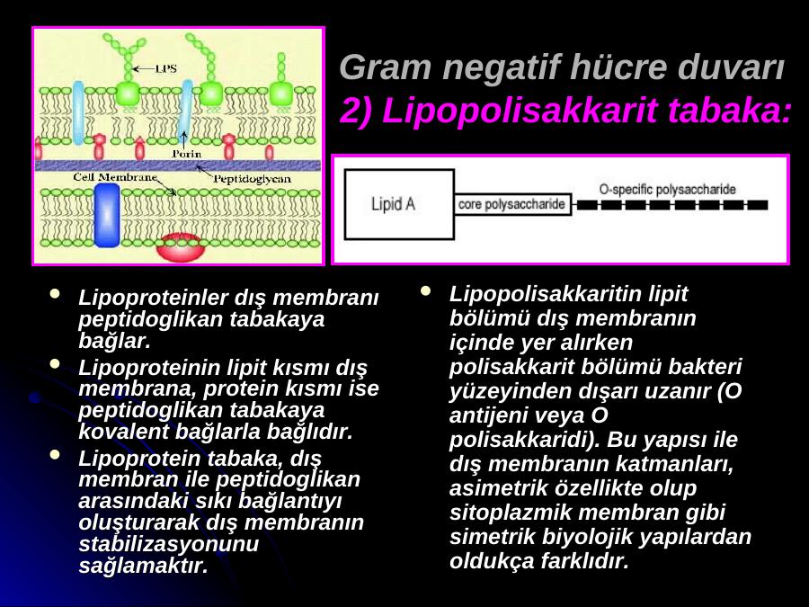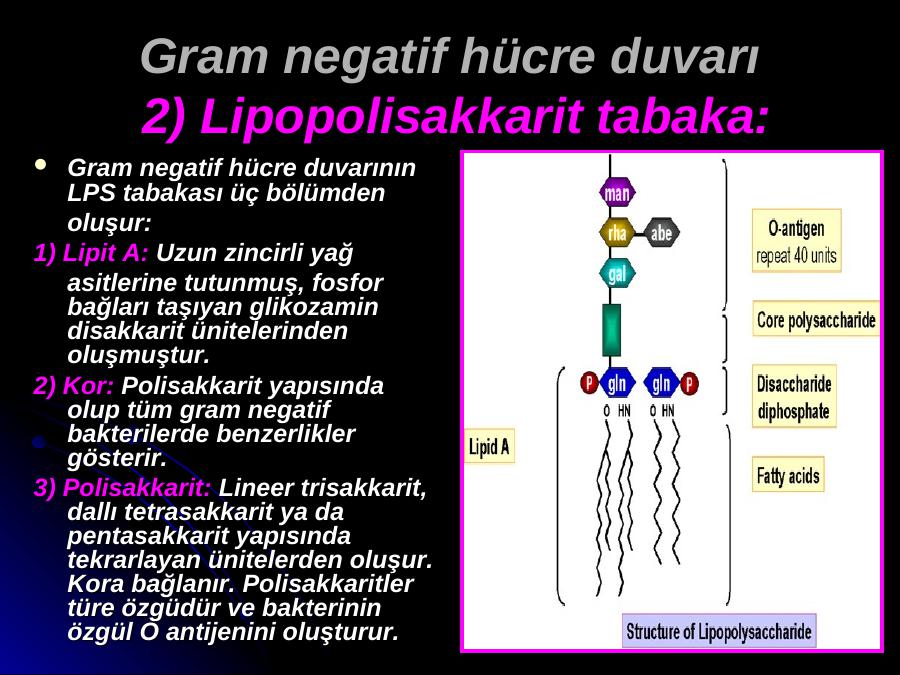 Gram negatif hücre duvarı 2) Lipopolisakkarit tabaka: Gram negatif hücre duvarının LPS tabakası üç bölümdenoluşur:1) Lipit A: Uzun zincirli yağ asitlerine tutunmuş, fosfor bağları taşıyan glikozamin disakkarit ünitelerinden oluşmuştur.2) Kor: Polisakkarit yapısında olup tüm gram negatif bakterilerde benzerlikler gösterir.3) Polisakkarit: Lineer trisakkarit, dallı tetrasakkarit ya da pentasakkarit yapısında tekrarlayan ünitelerden oluşur. Kora bağlanır. Polisakkaritler türe özgüdür ve bakterinin özgül O antijenini oluşturur.