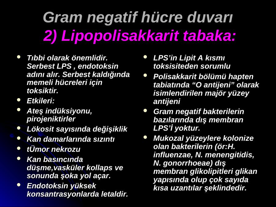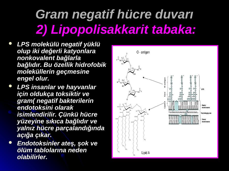Gram negatif hücre duvarı 2) Lipopolisakkarit tabaka: LPS molekülü negatif yüklü olup iki değerli katyonlara nonkovalent bağlarla bağlıdır. Bu özellik hidrofobik moleküllerin geçmesine engel olur. LPS insanlar ve hayvanlar için oldukça toksiktir ve gram( negatif bakterilerin endotoksini olarak isimlendirilir. Çünkü hücre yüzeyine sıkıca bağlıdır ve yalnız hücre parçalandığında açığa çıkar. Endotoksinler ateş, şok ve ölüm tablolarına neden olabilirler.