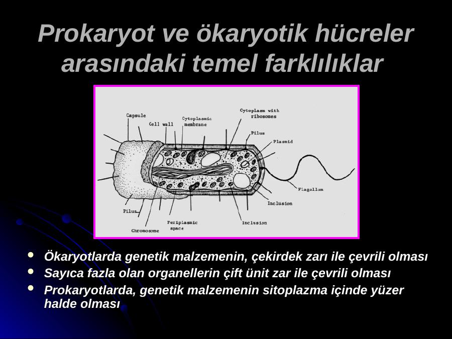 Prokaryot ve ökaryotik hücreler arasındaki temel farklılıklar Ökaryotlarda genetik malzemenin, çekirdek zarı ile çevrili olması Sayıca fazla olan organellerin çift ünit zar ile çevrili olması Prokaryotlarda, genetik malzemenin sitoplazma içinde yüzer halde olması