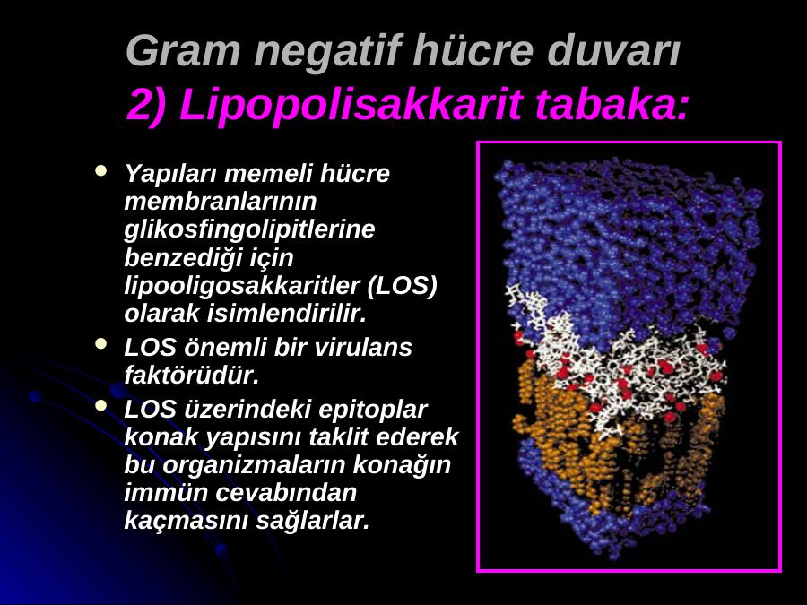 Gram negatif hücre duvarı 2) Lipopolisakkarit tabaka: Yapıları memeli hücre membranlarının glikosfingolipitlerine benzediği için lipooligosakkaritler (LOS) olarak isimlendirilir. LOS önemli bir virulans faktörüdür. LOS üzerindeki epitoplar konak yapısını taklit ederek bu organizmaların konağın immün cevabından kaçmasını sağlarlar.
