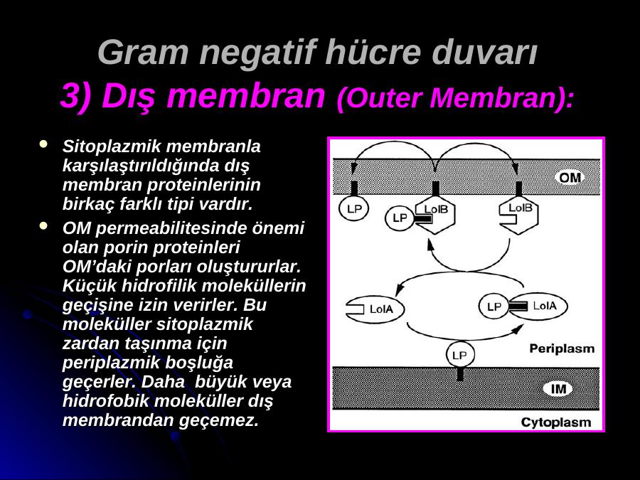Gram negatif hücre duvarı3) Dış membran (Outer Membran): Sitoplazmik membranla karşılaştırıldığında dış membran proteinlerinin birkaç farklı tipi vardır. OM permeabilitesinde önemi olan porin proteinleri OM’daki porları oluştururlar. Küçük hidrofilik moleküllerin geçişine izin verirler. Bu moleküller sitoplazmik zardan taşınma için periplazmik boşluğa geçerler. Daha büyük veya hidrofobik moleküller dış membrandan geçemez.