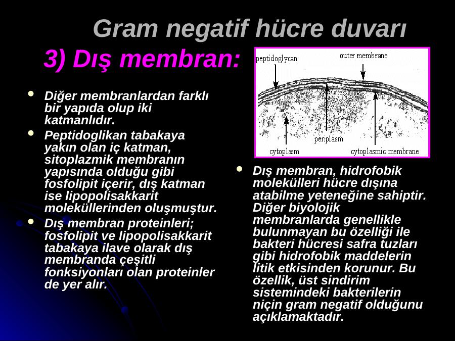 Gram negatif hücre duvarı3) Dış membran: Diğer membranlardan farklı bir yapıda olup iki katmanlıdır. Peptidoglikan tabakaya yakın olan iç katman, sitoplazmik membranın yapısında olduğu gibi fosfolipit içerir, dış katman ise lipopolisakkarit moleküllerinden oluşmuştur. Dış membran proteinleri; fosfolipit ve lipopolisakkarit tabakaya ilave olarak dış membranda çeşitli fonksiyonları olan proteinler de yer alır. Dış membran, hidrofobik molekülleri hücre dışına atabilme yeteneğine sahiptir. Diğer biyolojik membranlarda genellikle bulunmayan bu özelliği ile bakteri hücresi safra tuzları gibi hidrofobik maddelerin litik etkisinden korunur. Bu özellik, üst sindirim sistemindeki bakterilerin niçin gram negatif olduğunu açıklamaktadır.