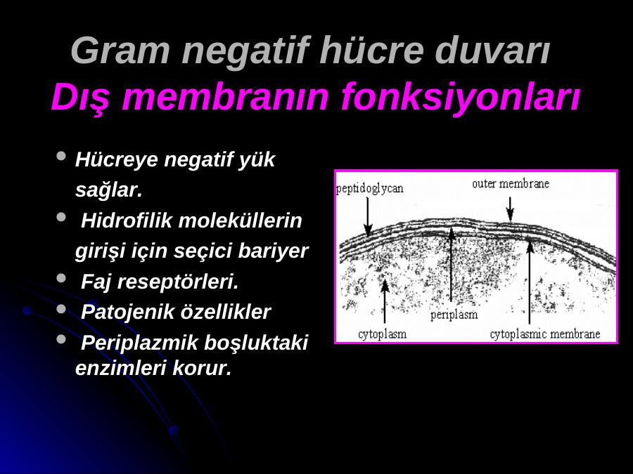 Gram negatif hücre duvarı Dış membranın fonksiyonları Hücreye negatif yük sağlar. Hidrofilik moleküllerin girişi için seçici bariyer Faj reseptörleri. Patojenik özellikler Periplazmik boşluktaki enzimleri korur.
