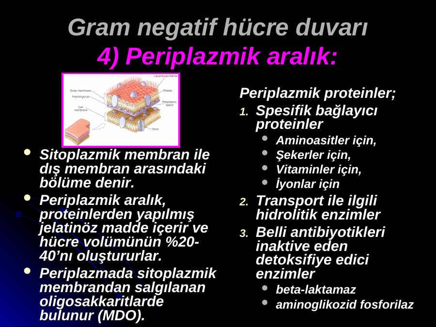 Gram negatif hücre duvarı4) Periplazmik aralık: Sitoplazmik membran ile dış membran arasındaki bölüme denir. Periplazmik aralık, proteinlerden yapılmış jelatinöz madde içerir ve hücre volümünün %20-40’nı oluştururlar. Periplazmada sitoplazmik membrandan salgılanan oligosakkaritlarde bulunur (MDO).Periplazmik proteinler; 1. Spesifik bağlayıcı proteinler Aminoasitler için, Şekerler için, Vitaminler için, İyonlar için2. Transport ile ilgili hidrolitik enzimler3. Belli antibiyotikleri inaktive eden detoksifiye edici enzimler beta-laktamaz aminoglikozid fosforilaz